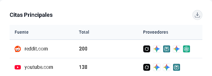 Qué fuentes cita la IA cuando responde a tus prompts y cuántas veces. Esencial para la estrategia de contenidos.